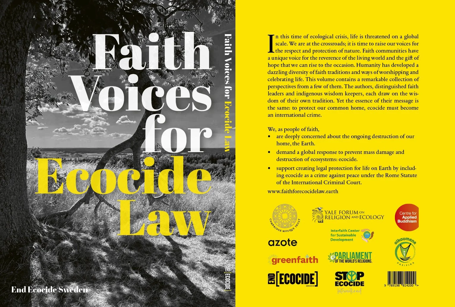 „Faith Voices for Ökozid-Konzept von End Ecocide Sweden und Stop Ecocide International gemeinsam mit folgenden Partnern herausgegeben: Cambridge Mosque Trust, Centre for Applied Buddhism, Green Faith, Interfaith Centre for Sustainable Development, Parliament of World’s Religions, Pacific Conference of Churches, Yale Forum on Religion and Ecology und Azote.